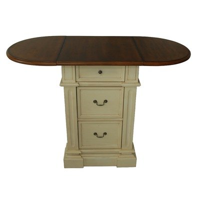 Two drawers for storage w decorative top drawer . Top in traditional cherry finish and base in antique white finish. No assembly required. 52 in. L x 26 in. W x 36 in. H The drop leaf Avondale Counter Table presents solutions to a multitude of function and space problems. Raise the leaves and you have dining for two, drop them and regain space in a crowded kitchen. For larger spaces this piece makes the perfect work station or center island