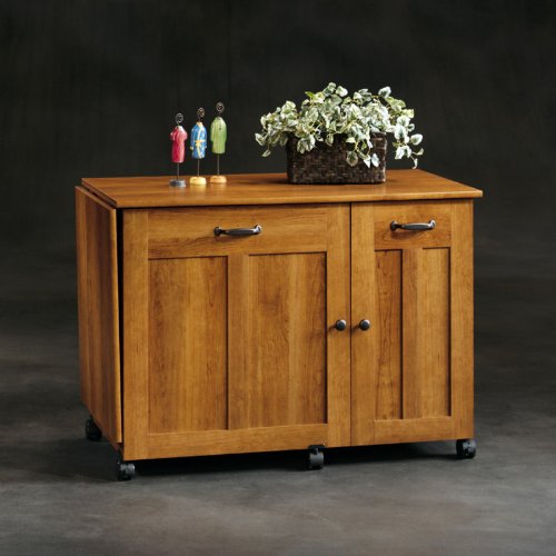 Drop leaf provides extra work space for sewing or crafts . Storage behind roll-open door includes 2 storage bins and hidden shelf for sewing machine . 2 Adjustable shelves behind door . Melamine top surface is heat, stain and scratch-resistant . Easy-roll casters . Made of engineered wood . Assembly required . 40 in. W x 19 in. D x 29 in. H